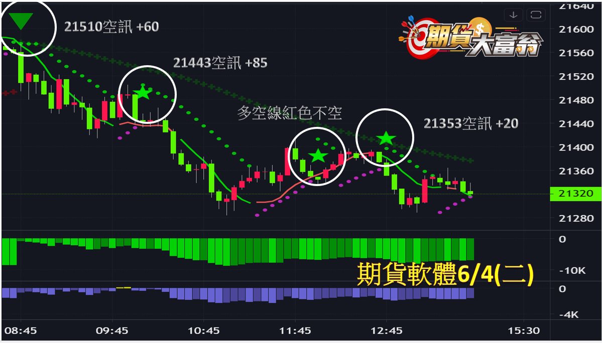 台指期今日走勢震盪向下,共有3次進場操作機會,第一次於早盤21510點出現空訊作空,直到多空線翻紅回補,獲利60點;第2次於隨後21443點出現空訊作空,直到多空線翻紅回補,獲利85點;第3次於午盤21353點出現空訊作空,到接近收盤前以市價回補,獲利約20點;統計今日操作共可獲利185點。