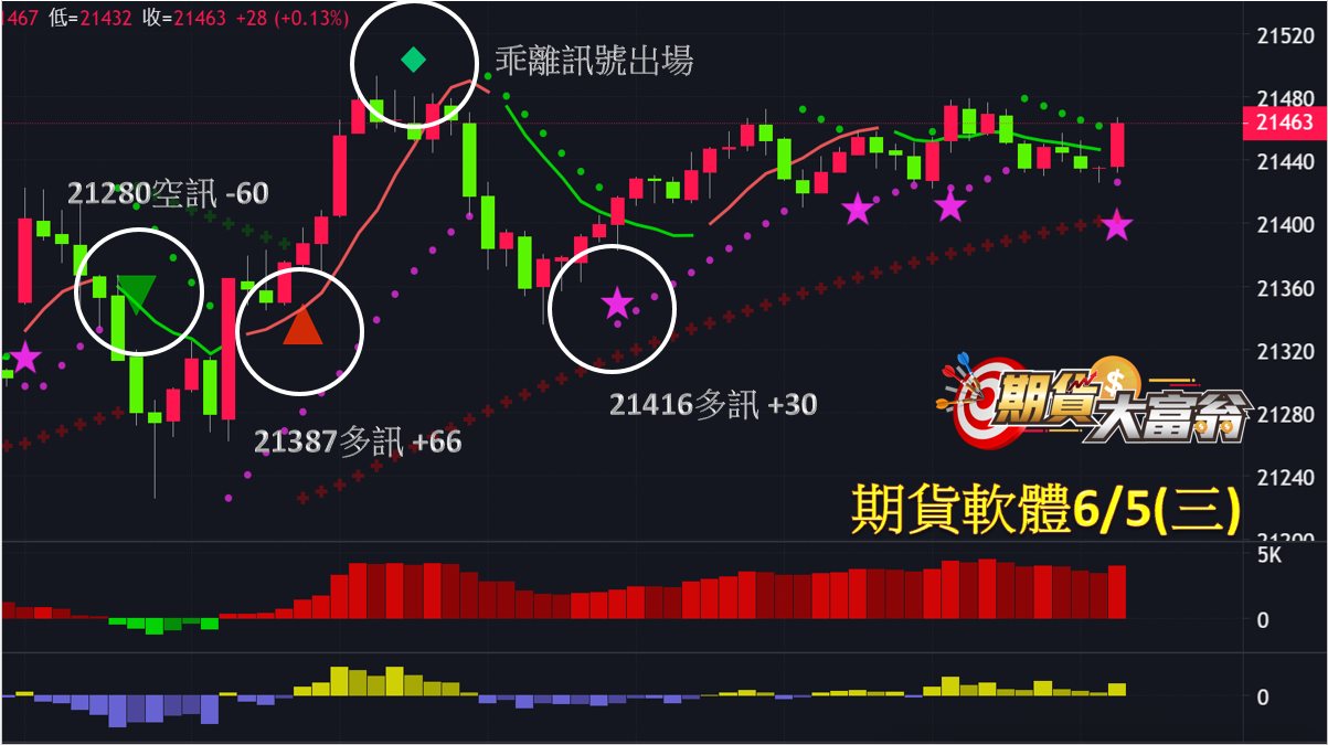 台指期今日走勢先下後上,共有3次進場操作機會,第一次於早盤21280點出現空訊作空,虧損60點;第2次於隨後21387點出現多訊作多,直到乖離訊號出場,獲利66點;第3次於午盤21416點出現多訊作多,獲利約30點;統計今日操作共可獲利36點。