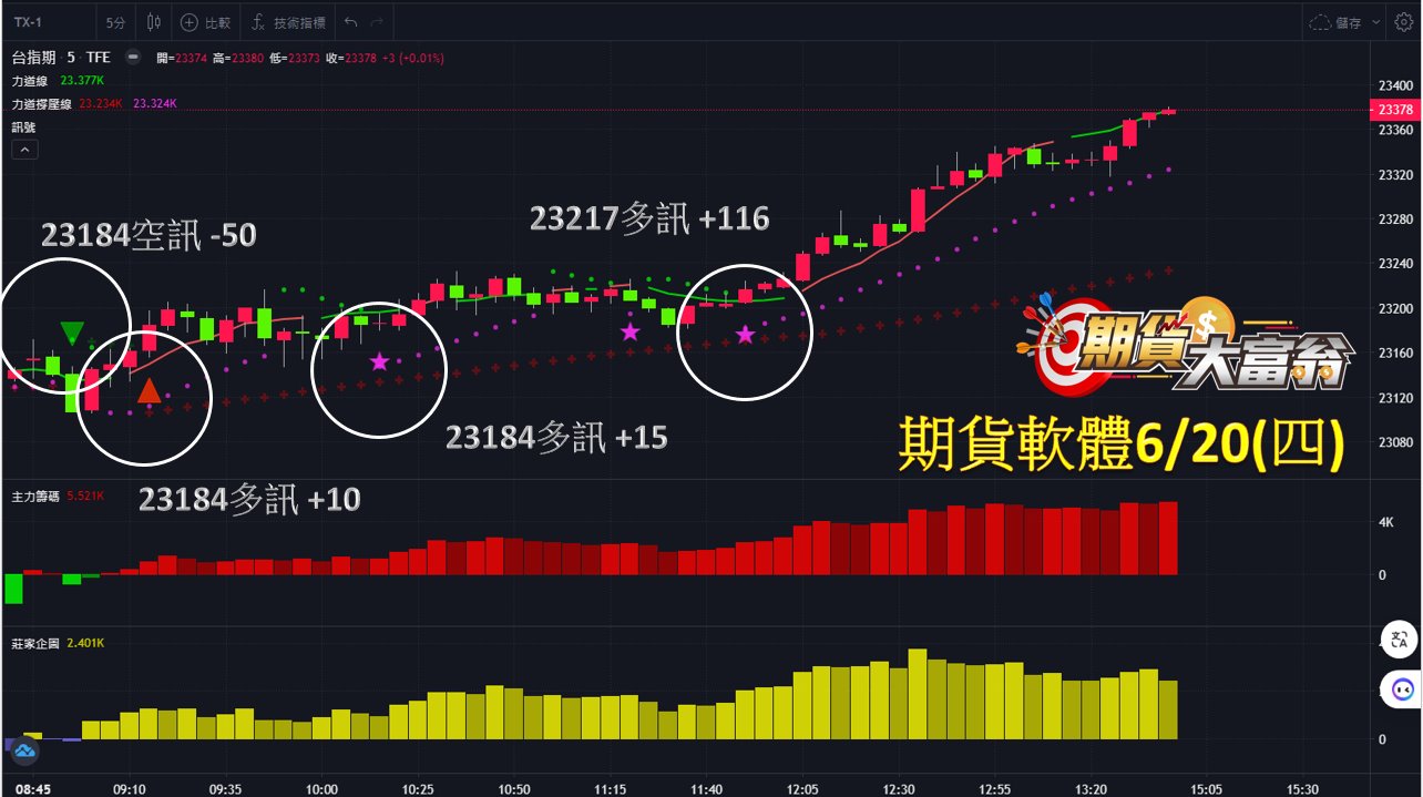 台指期今日走勢震盪向上,共有4次進場操作機會,首次於開盤23184點出現空訊作空,虧損50點;第二次於23184點出現多訊作多,獲利10點;第三次於23184點出現多訊作多,獲利15點;第四次於23217點出現多訊作多,直至多空力道線翻綠出場,獲利達116點;統計今日操作共可獲利91點。