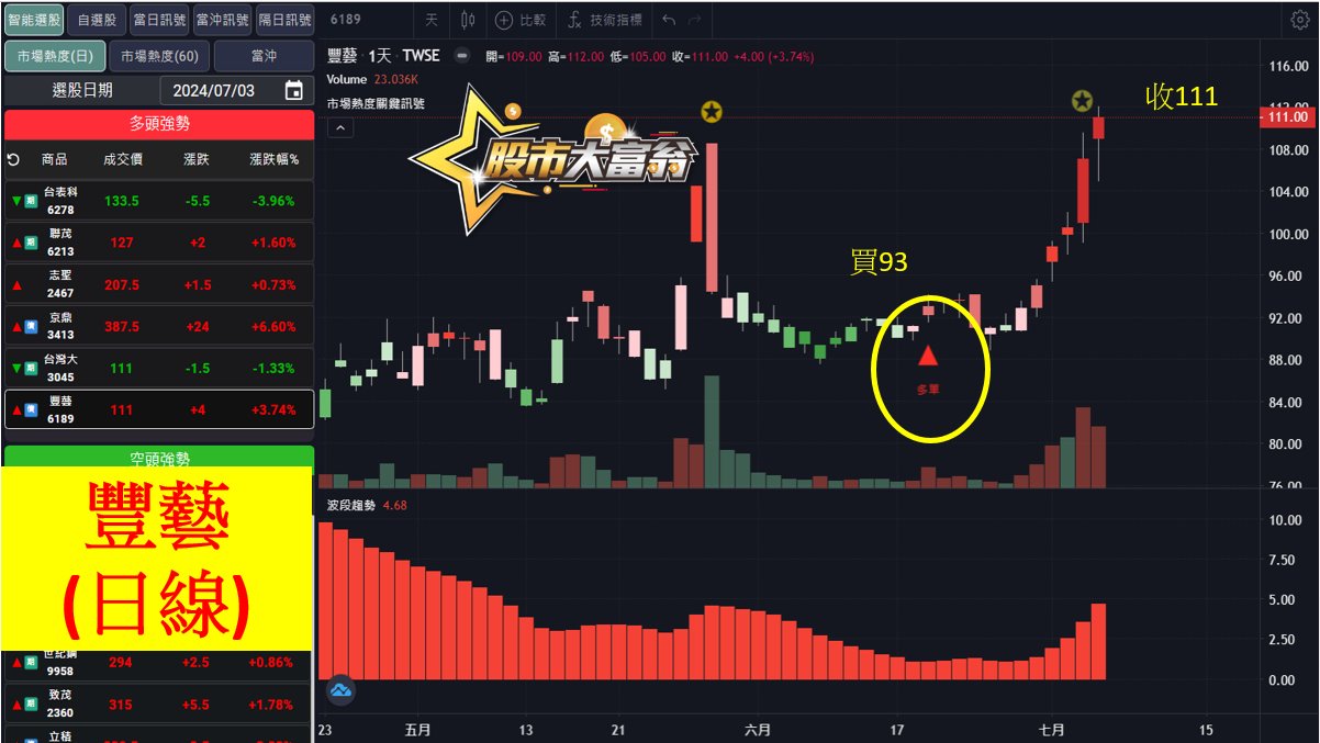 台指期今日走勢震盪向上,共有4次進場操作機會,第1、2次分別於早盤23494、23532點出現多訊作多,直至多空線翻綠出場,可分別獲利114、76點;第三次於23502點出現空訊作空,虧損約35點;第四次於23580點出現多訊作多,直至收盤前以市價出場,獲利44點;統計今日操作共獲利達199點。