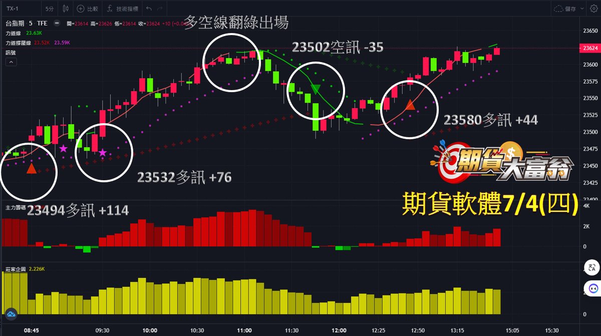 第1、2次分別於早盤23494、23532點出現多訊作多,直至多空線翻綠出場,可分別獲利114、76點;