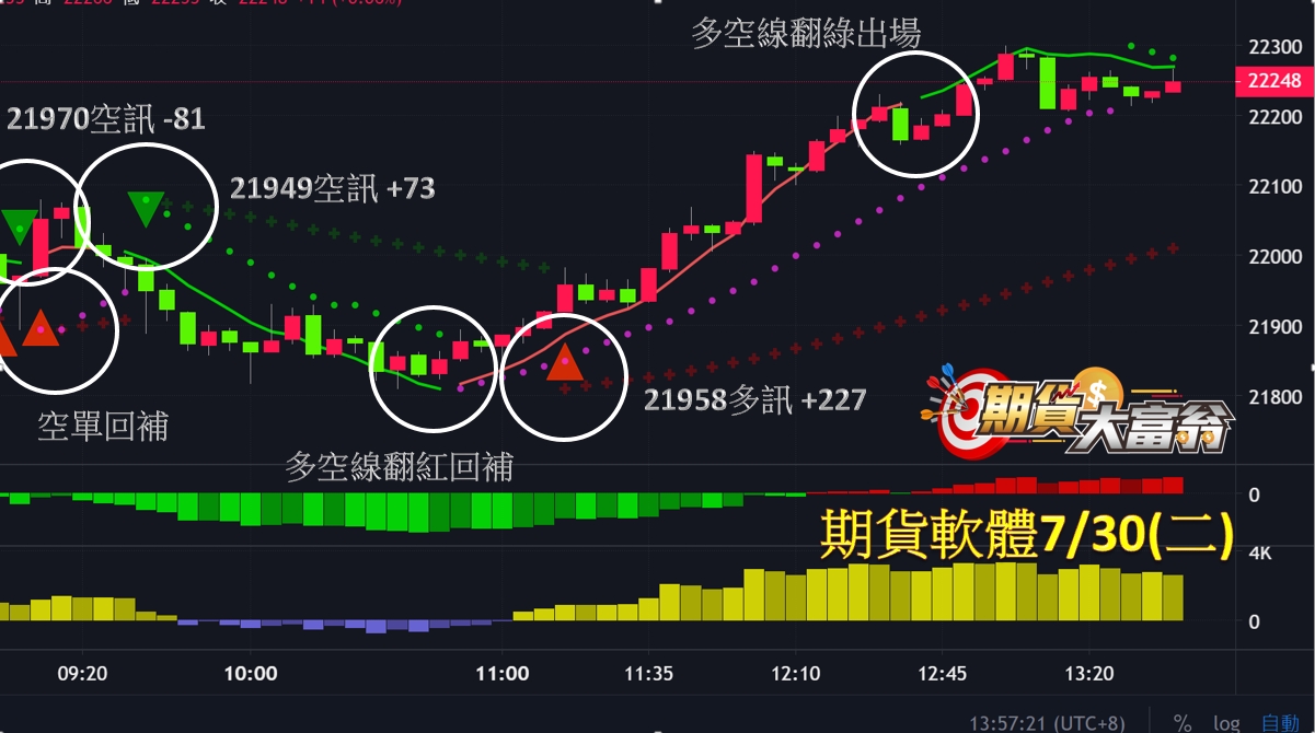台指期今日走勢先下後上,共有3次進場操作機會,第1次於開盤21970點出現空訊作空,虧損81點;第2次於隨後21949點出現空訊作空,直至多空線翻紅回補,獲利73點;第3次於21958點出現多訊作多,直至多空線翻綠出場,獲利達227點;統計今日操作共可獲利高達219點。