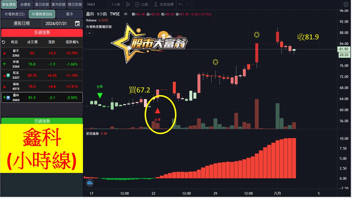 台指期今日走勢先下後上,共有2次進場操作機會,第1次於早盤226000點出現空訊作空,直至多空線翻紅回補,獲利70點;第2次於隨後22616點出現多訊作多,直至多空線翻綠出場,小賺4點;統計今日操作共獲利74點。