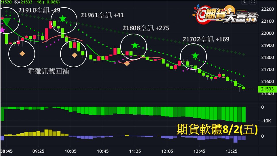 台指期今日走勢一路向下,共有4次進場操作機會,第1次於開盤21900點出現空訊作空,直至乖離訊號回補,虧損49點;第2次於隨後21961點出現空訊作空,直至乖離訊號回補,獲利41點;第3、4次分別於21808、21702點出現空訊作空,直至接近收盤前以市價回補,分別獲利高達275、169點;統計今日操作共可獲利高達436點。