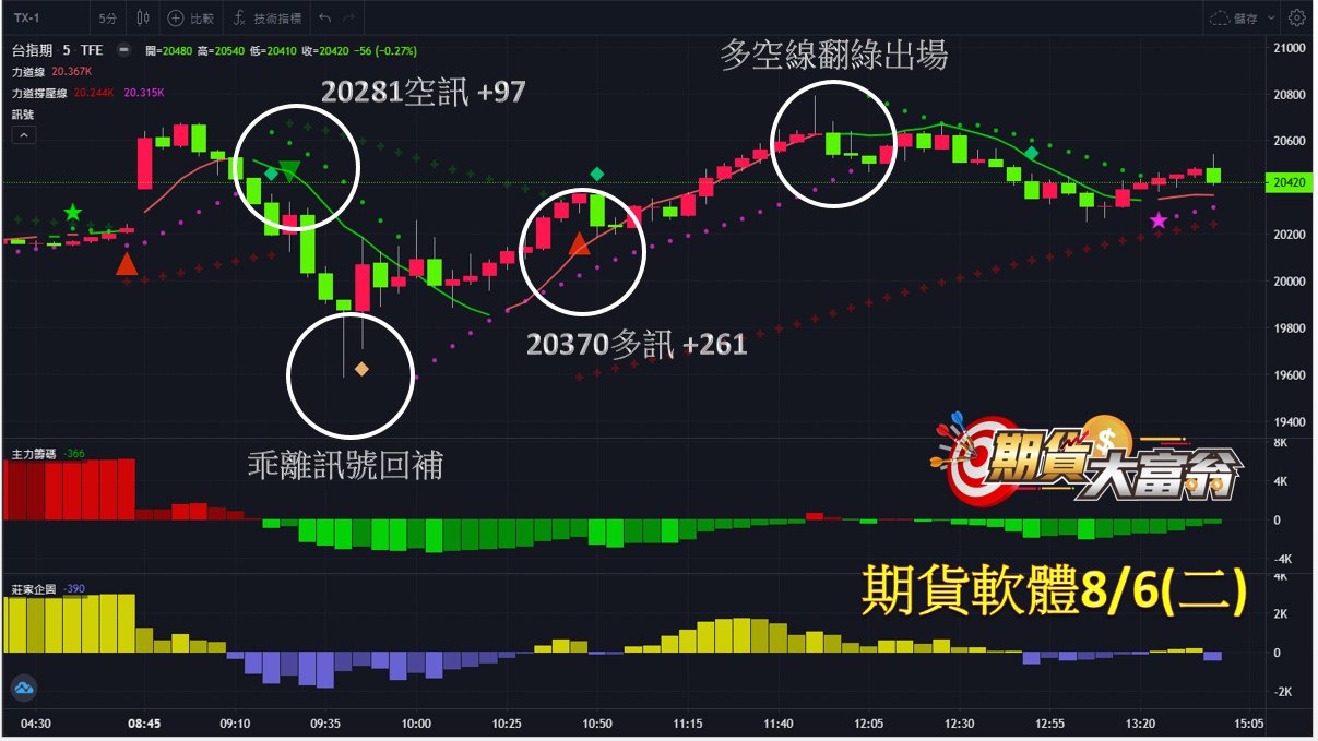 台指期今日走勢先下後上,共有2次進場操作機會,第一次於早盤20281點出現空訊作空,直至乖離訊號回補,獲利97點;第二次於之後20370點出現多訊作多,直至多空線翻綠出場,可獲利高達261點;統計今日操作共可獲利高達358點。
