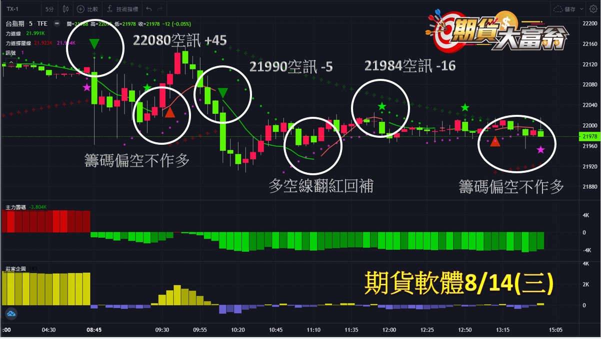 台指期今日走勢向下,共有3次進場操作機會,