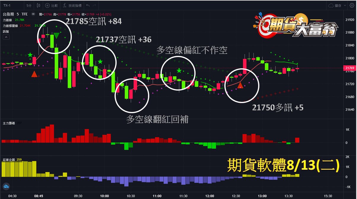第1、2次於早盤21785、21737點出現空訊作空,直至多空線翻紅回補,可分別獲利84、36點;