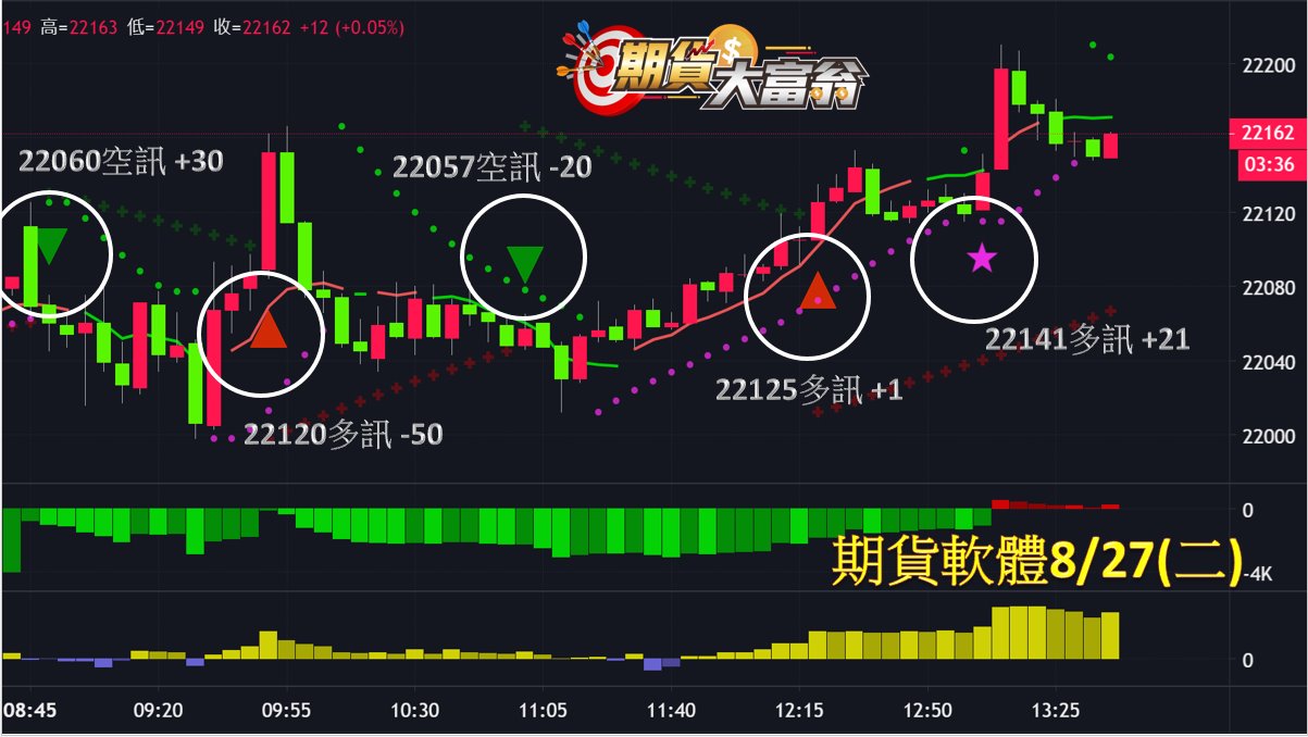 台指期今日行情震盪、走勢先下後上,共有5次操作機會,第1次於22060點出現空訊作空,獲利30點;第2次於22120點出現多訊作多,虧損50點;第3次於22057點出現空訊作空,虧損20點;第4、5次於22125、22141點出現多訊作多,分別獲利1、21點;統計今日操作僅虧損18點。