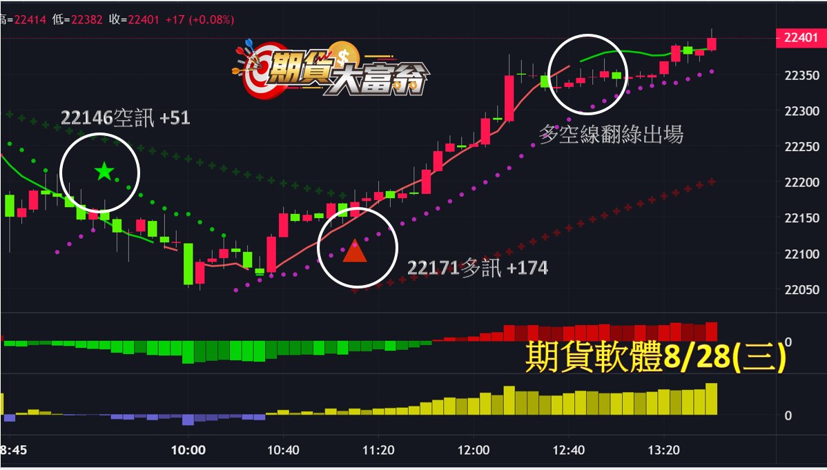 台指期今日走勢先下後上,共有2次操作機會,第1次於早盤22146點出現空訊作空,獲利51點;第2次於22171點出現多訊作多,直至多空線翻綠出場,獲利達174點;統計今日操作可獲利高達225點。