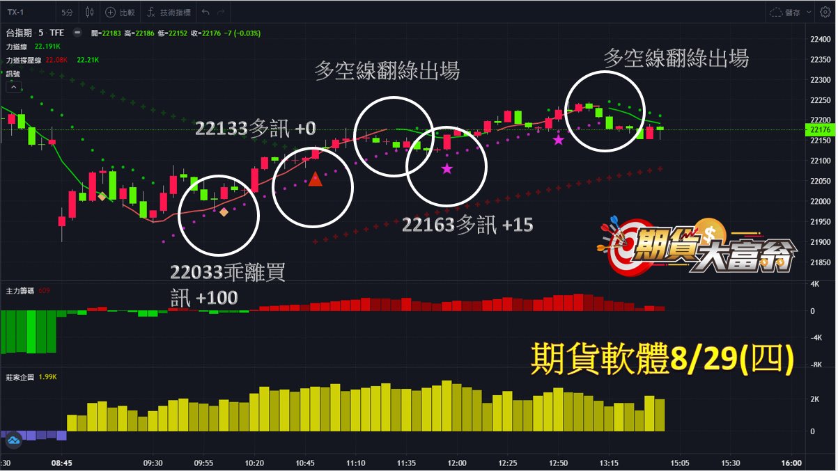 台指期今日走勢偏多向上,共有3次操作機會,第1次於早盤22033點出現乖離買訊作多,第2次於22133點出現多訊作多,皆直至多空線翻綠出場,可分別獲利100、0點;第3次於22163點出現多訊作多,直至多空線翻綠出場,獲利15點;統計今日操作可獲利115點。