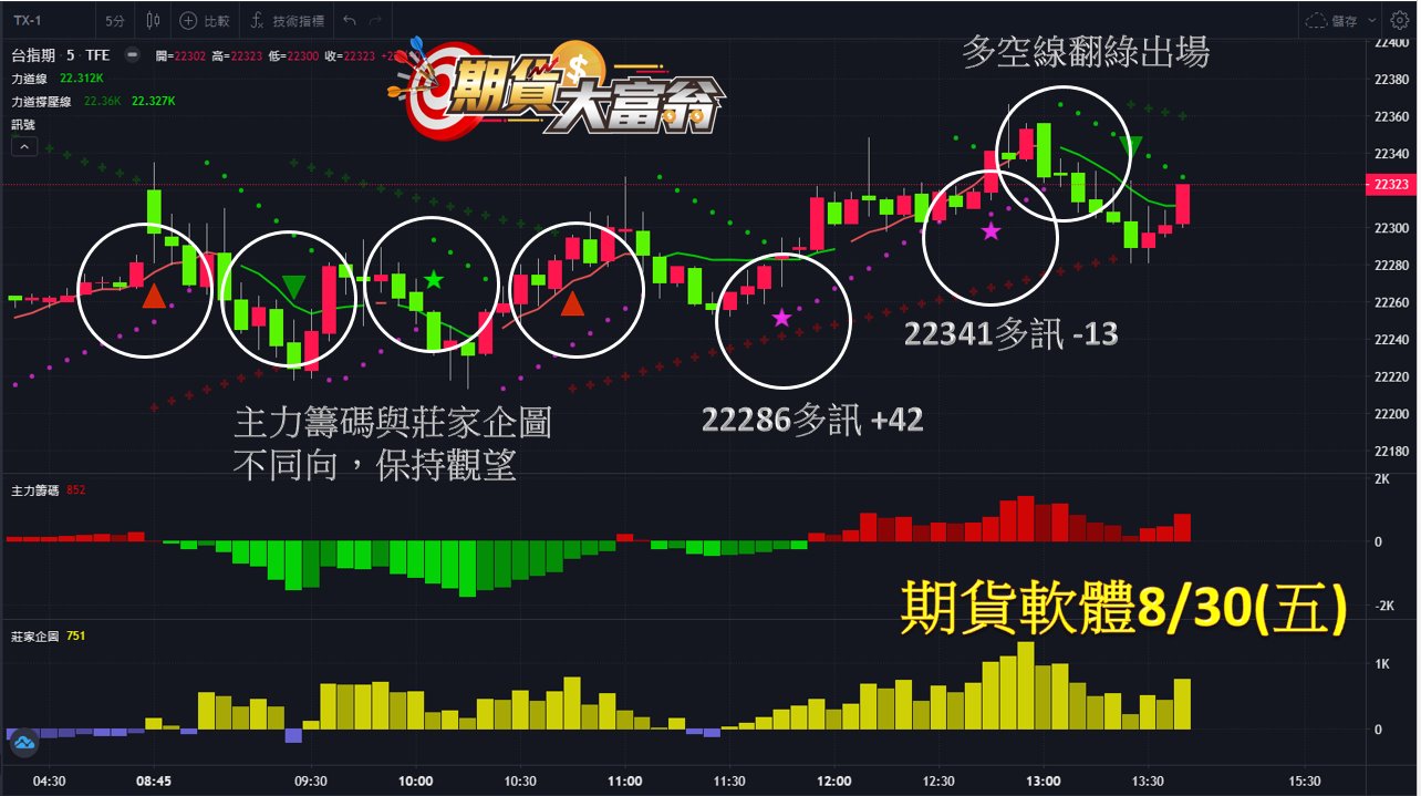 台指期今日走勢橫盤整理,早盤因主力籌碼與莊家企圖不同向而保持觀望,之後共有2次操作機會,第1、2次分別於22286、22341點出現多訊作多,皆至多空線翻綠出場,可分別獲利42、-13點;統計今日操作可獲利29點。