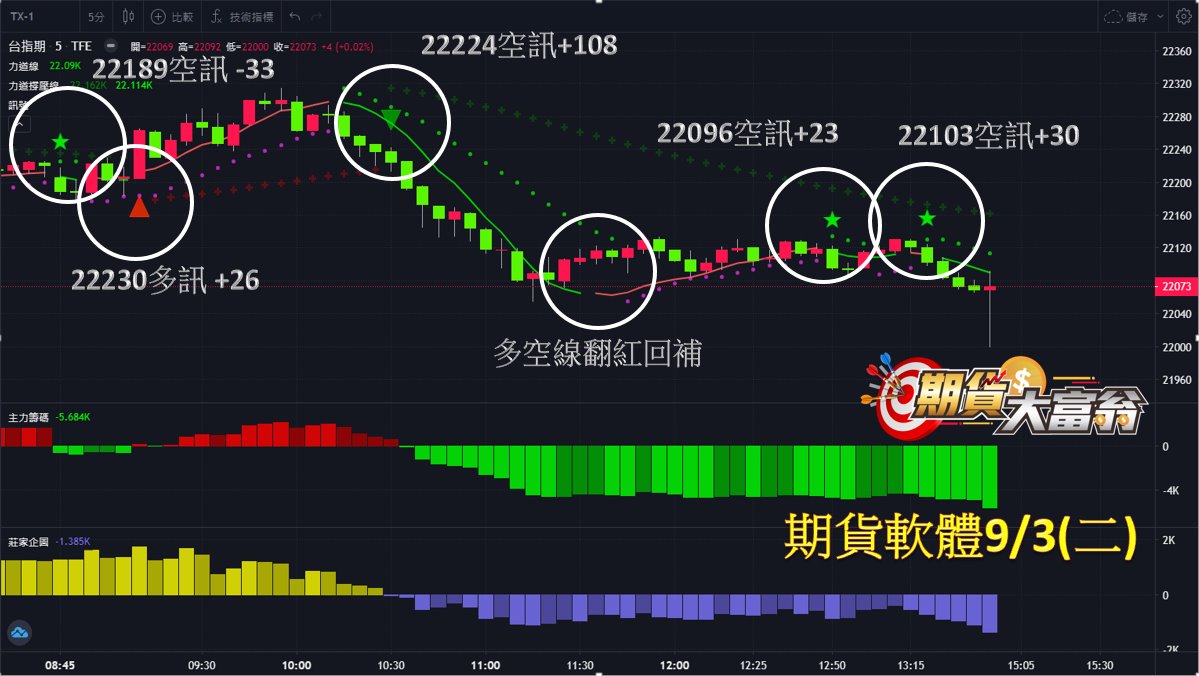 台指期今日走勢先上後下,共有5次操作機會,第1次於22189點出現空訊作空,虧損33點;第2次於22230點出現多訊作多,獲利26點;第3次於22224點出現空訊作空,直至多空線翻紅回補,獲利達108點;第4、5次分別於22096、22103點出現空訊作空,直至收盤前以市價回補,分別獲利約23、30點;統計今日操作獲利達154點。