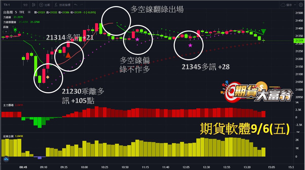 台指期今日走勢上下震盪,共有3次操作機會,第1次於早盤21230點出現乖離多訊作多,第2次於隨後21314點出現多訊作多,皆至多空線翻綠出場,分別可獲利105、21點;第3次於午盤21345點出現多訊作多,至多空線翻綠出場,獲利28點;統計今日操作共獲利達154點。