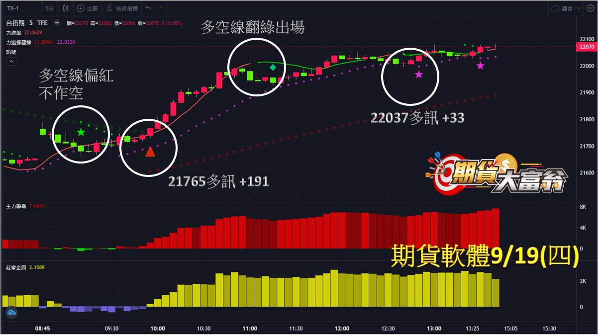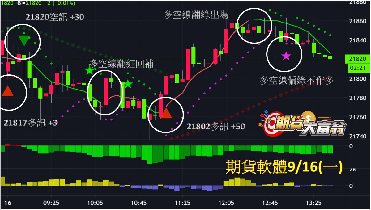 第1次於早盤21765點出現多訊作多,至多空線翻綠出場,可獲利高達191點;