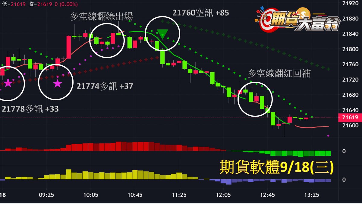 第3次於21760點出現空訊作空,至多空線翻紅回補,獲利約85點;