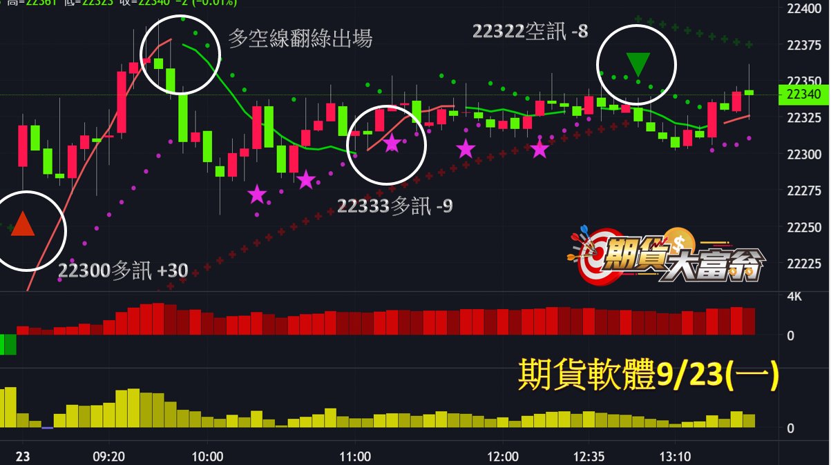 台指期今日走勢偏多卻緩步震盪,共出現3次操作機會,第1次於開盤22300點出現多訊作多,至多空線翻綠出場,獲利約30點;第2次於22333點出現多訊作多,小虧9點;第3次於尾盤22322點出現空訊作空,至接近收盤前以市價回補,小虧8點;統計今日操作共獲利13點。