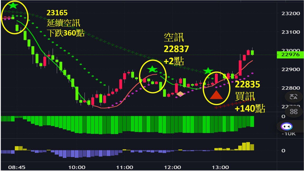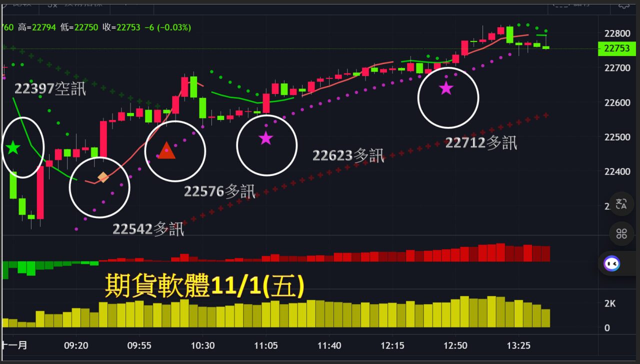 11/1(五)今天台指期精彩開低走高,如果有看早報的話,我預估的高點22800低點22250,幾乎完全命中,策略站穩開盤價偏多操作,搭配軟體出現四次買訊一路走高,今天真是太精采