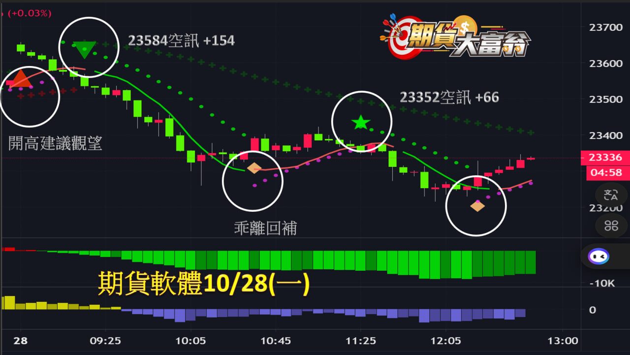 10/29(二)AI智慧期貨系統,開盤延續空訊果然下跌,到多空線翻紅可以大賺360點,尾盤轉買訊+140點!!!