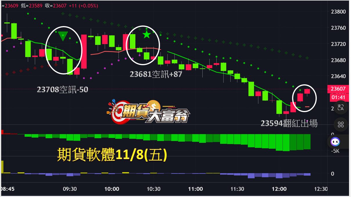 今天11/08(五)台指期開高震盪較大,但是我們會員還是在這個震盪的市場中獲利,今天出現了兩次訊號,開盤價破,先緩拉回,如早報預期 ! !