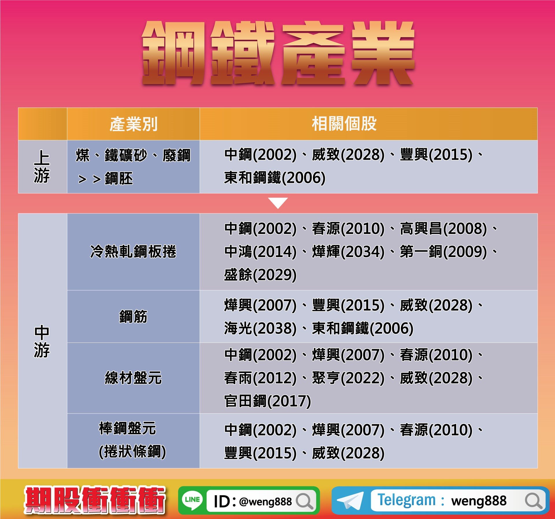 鋼鐵依材質可分為「碳鋼」及「不銹鋼與合金鋼」兩大類,鋼鐵產業的上游為煤、鐵礦砂及廢鋼原料,這些原料要經高爐或電爐煉製而成的鋼胚與不銹鋼胚,高爐煉鋼的代表廠商就我們大家熟悉的中鋼,主要用到的原料為鐵礦砂與焦煤。另一種電爐煉鋼的主要原料為廢鋼,至於不鏽鋼屬於鋼品產業的特殊鋼材,與碳鋼的差別在中游多了裁剪加工和製管業,因為大量使用鎳、鉻等高價金屬原料,成本比較高應用也相檔廣泛,也容易受到金屬的價格波動的影響。