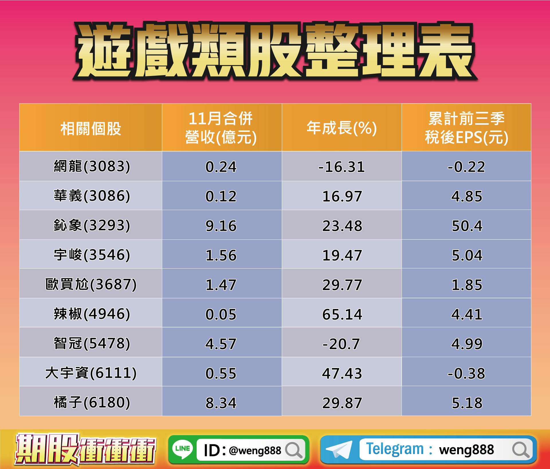 台股相關遊戲公司歐買尬、宇峻、弘煜科、大宇資、辣椒等11月營收同寫年月雙增佳績。