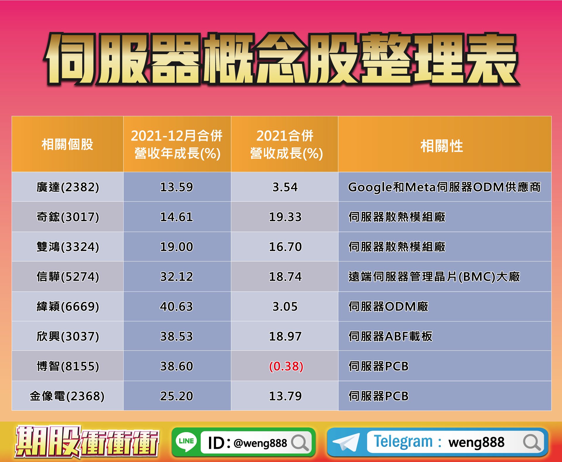 帶動伺服器相關概念股轉強,緯穎、信驊、奇鋐、博智等成長看俏。