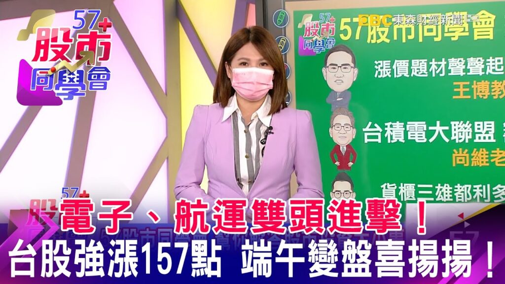 【摘要】 電子、航運雙頭進擊! 台股強漲157點 端午變盤喜揚揚! 漲價題材聲聲起! 電子多頭火力增溫 王博教…